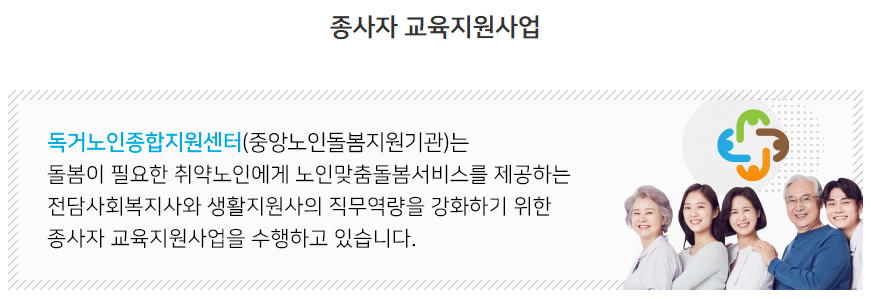 기존 종사자(경력자)를 대상으로 하며, 고위험 노인관리, 치매 및 상담, 자원연계, ICT 스마트돌봄 등 보다